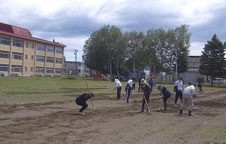 グランドの除草が主な作業となりました。内容を縮小し、感染対策を行いつつ、ご都合のつく方にお集まりいただき作業を行いました。ありがとうございました。
